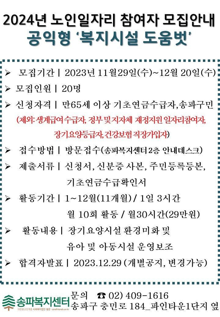 2024년 공익형 노인일자리 복지시설 도움벗 참여자 모집