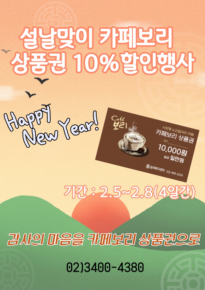 민족의 명절인 설날을 맞아 카페보리 상품권 할인행사를 진행합니다.
