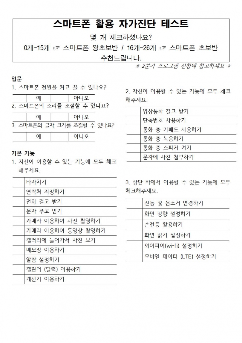 16개~26개 할 수 있다고 체크하셨다면 '스마트폰 초보반' 수강을 추천드립니다!!