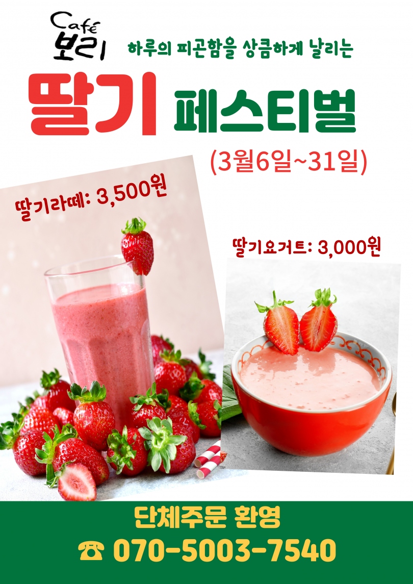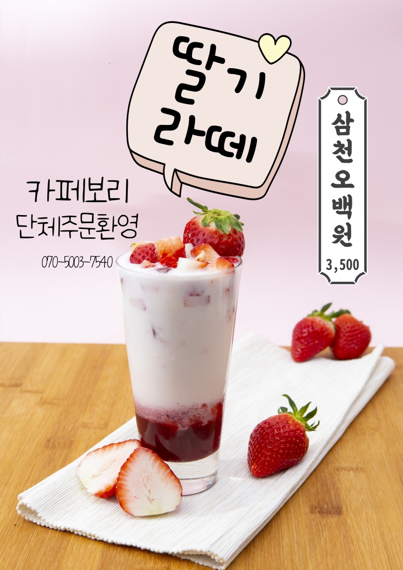 어르신들이 직접 담그신 딸기청으로 만든 딸기라떼, 딸기요거트 카페보리에서 맛 보실 수 있어요~~