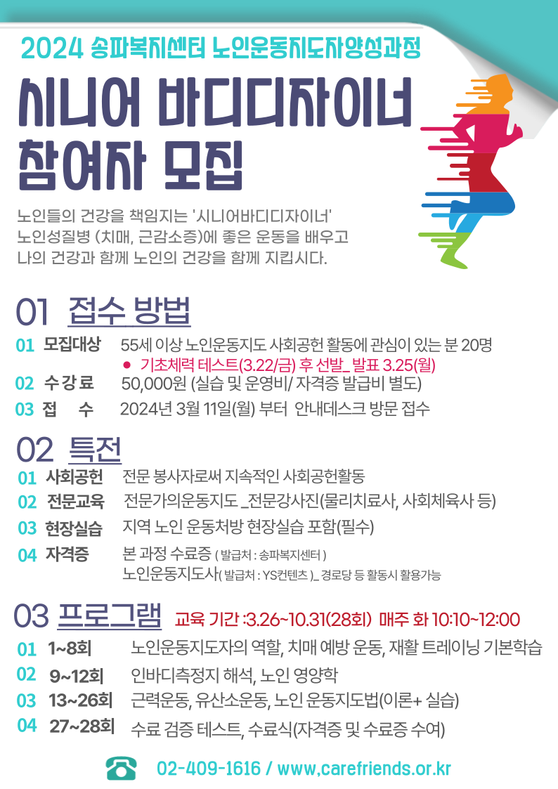 | 2024년 송파구 생활체육회와 함께 하는 기초근력체조 개강 안내 (0) | 2024.03.04 |
