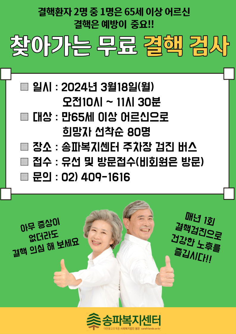 | 송파구 보건소 연계 '찾아가는 무료결핵검진' 서비스 진행 (0) | 2024.03.21 |