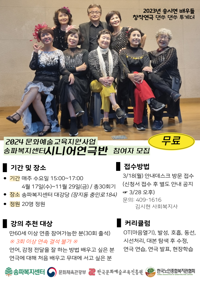 2024년 문화예술교육지원사업 '시니어연극반'의 배우(만60세 이상)를 찾습니다.