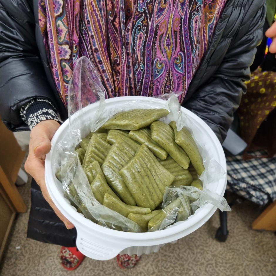 오늘은 쑥떡을 한가득 갖고 맛 좀 보라고 가져오셔서 무슨 일인지 여쭤보았습니다.