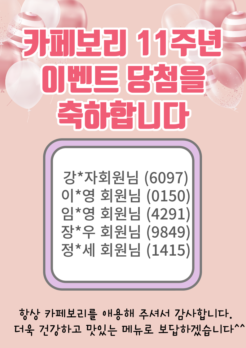 11주년의 기쁨을 회원님과 같이 나누고 기념하고자 11주년 이벤트 응모권 당첨자 발표합니다!