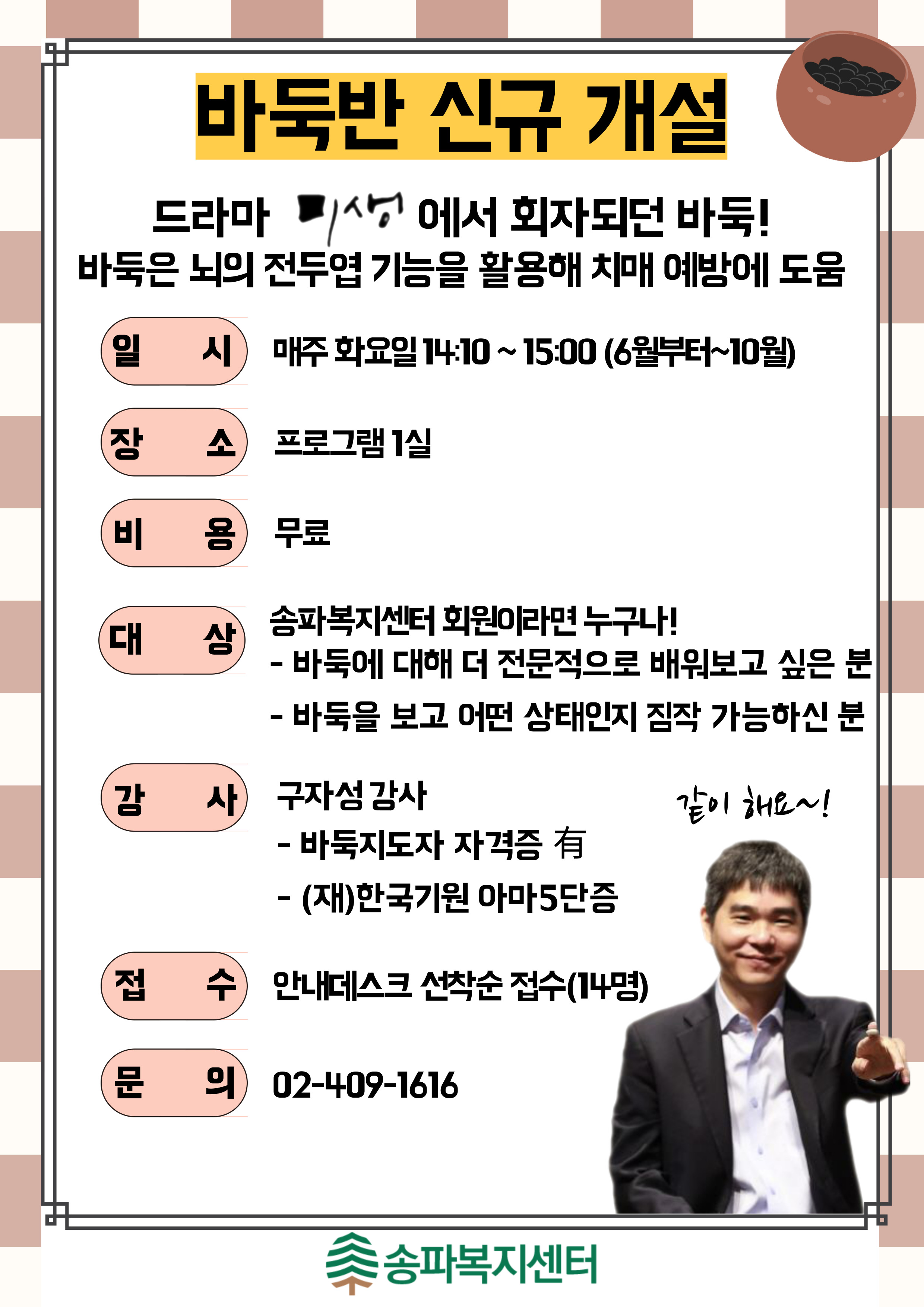 바둑반이 6월 13일부터 10월까지, 매주 화요일 14:10~15:00에 신설되었습니다.