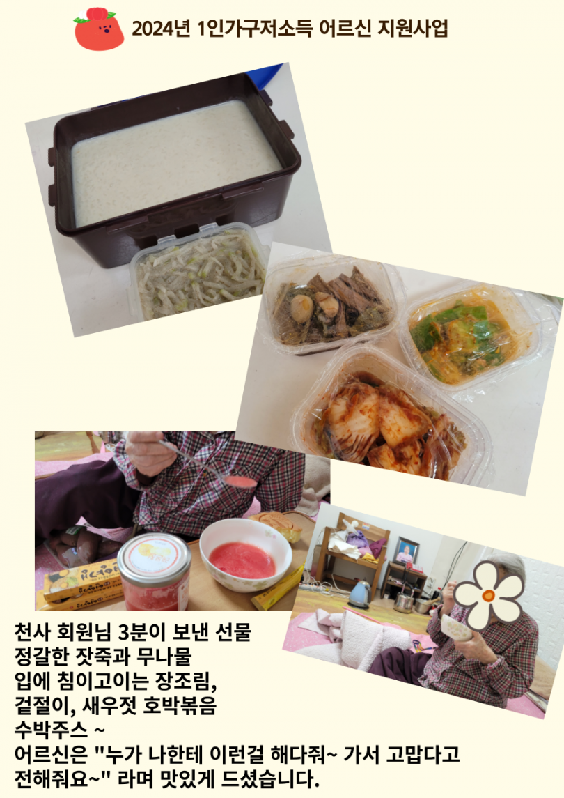| 2024년 송파발달장애인평생교육센터와 함께 1인가구저소득어르신 중복 닭죽 나눔 진행 (0) | 2024.08.05 |