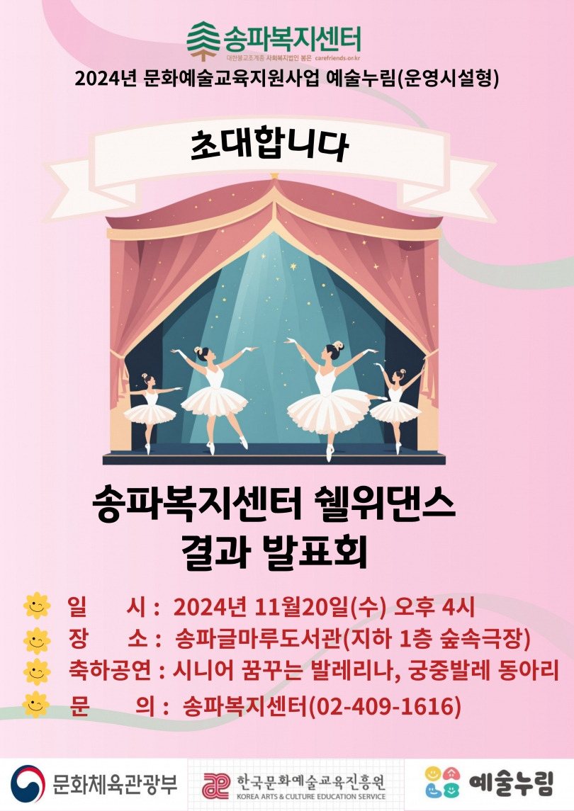 2024년 문화예술교육 지원사업 예술누림 '쉘위댄스' 발표회 진행되었습니다. (0) | 2024.11.25 |