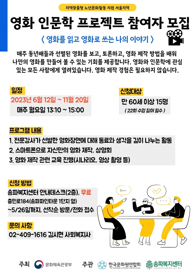 영화와 인문학을 좋아하시는 많은 사람에게 가닿고자 공모 사업에 선정되어 무료로 진행하며, 선착순 접수입니다.