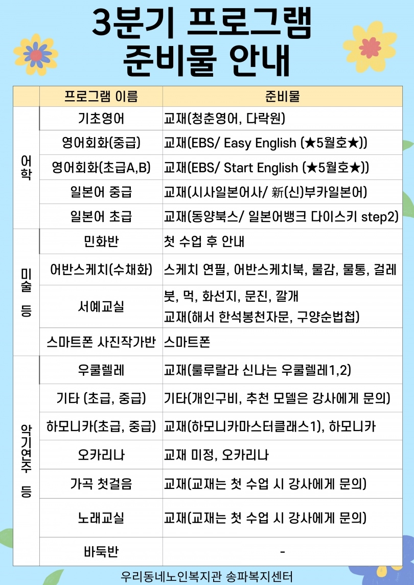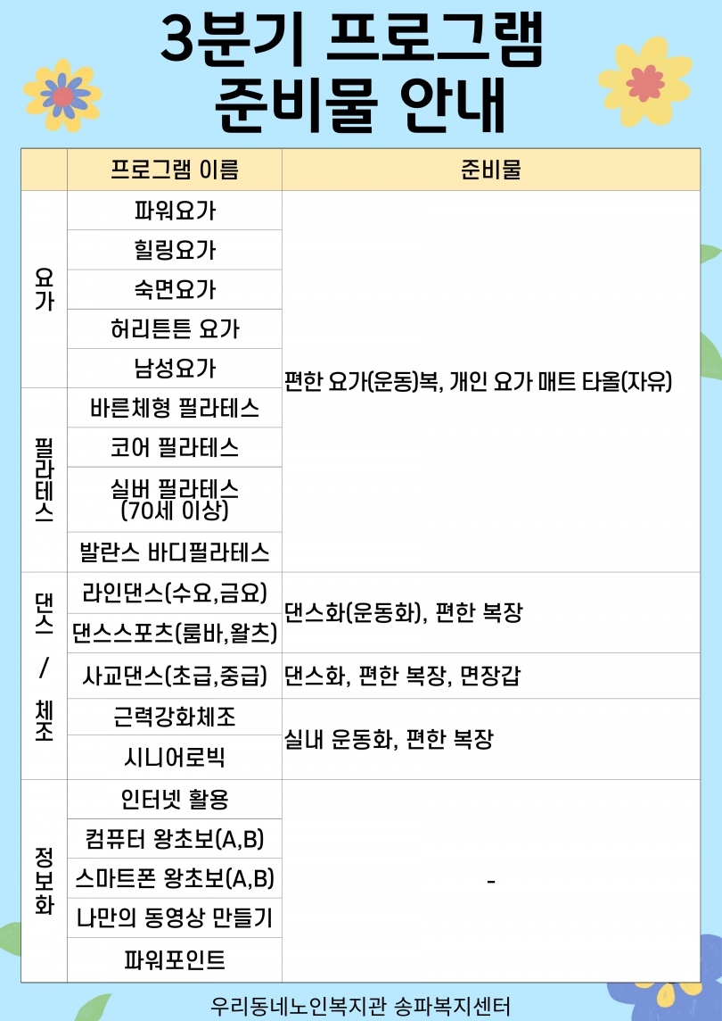 7월부터 진행되는 3분기 프로그램별 준비물 안내드립니다.