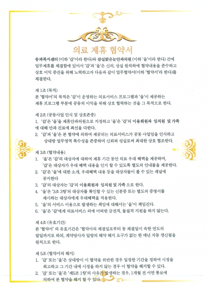 2023.6.27. 잠실에 위치한 밝은 눈안과와 의료서비스 제휴 협약을 체결하였습니다.