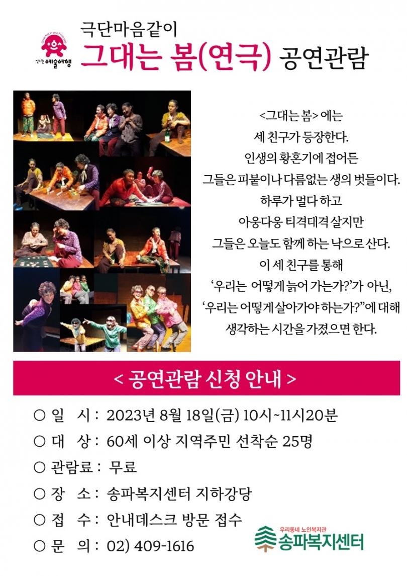 | 신나는 예술여행 극단 마음가치의 '그대는 봄' 연극공연 진행 (0) | 2023.08.21 |