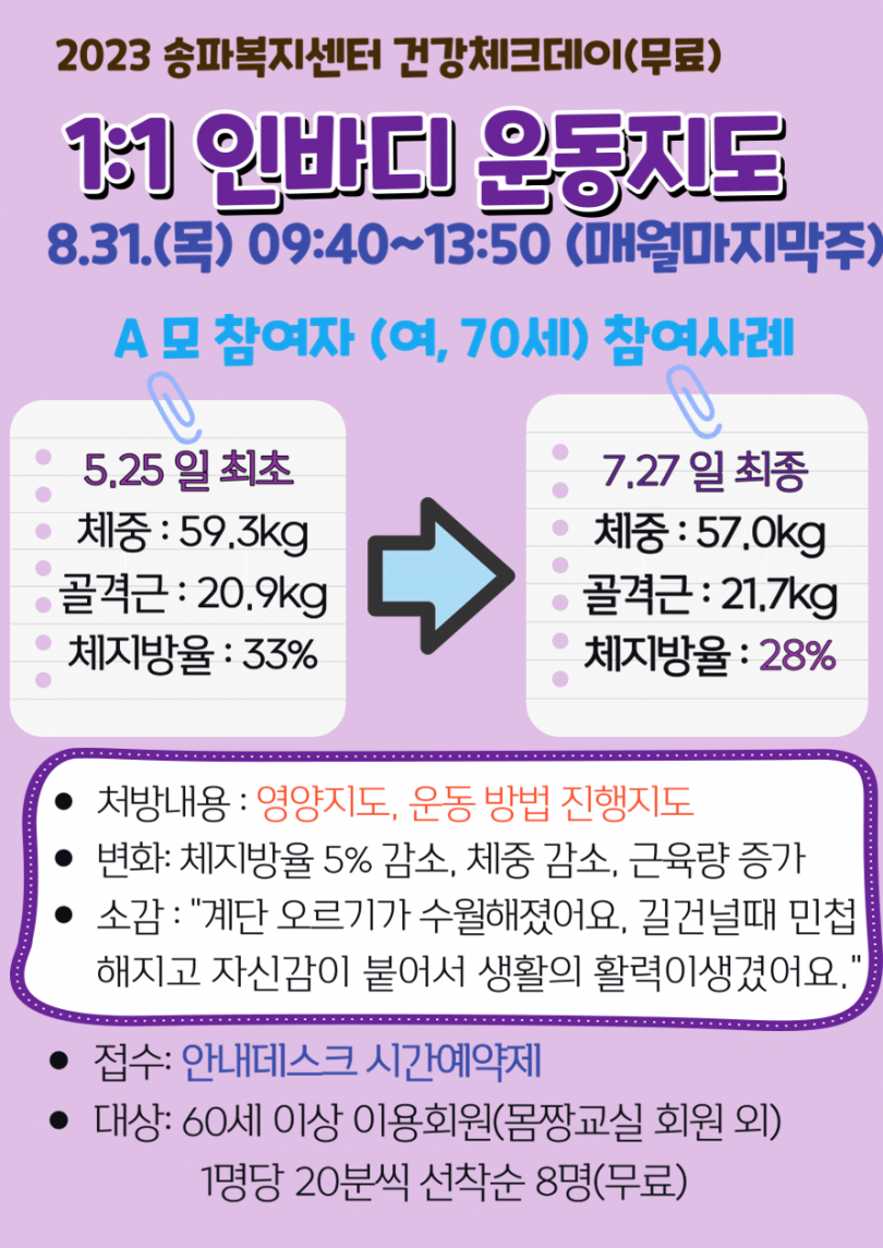 8.31 (목) 일대일 인바디 체크 및 운동지도가 진행됩니다.