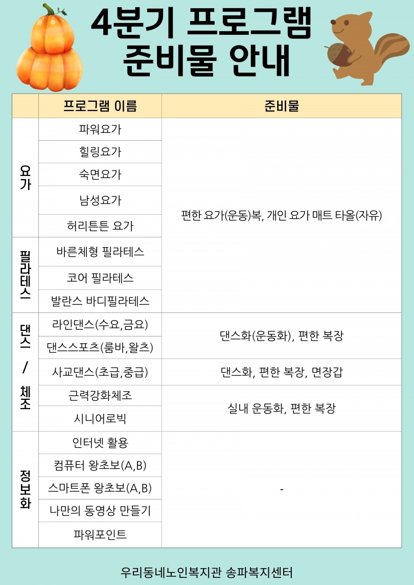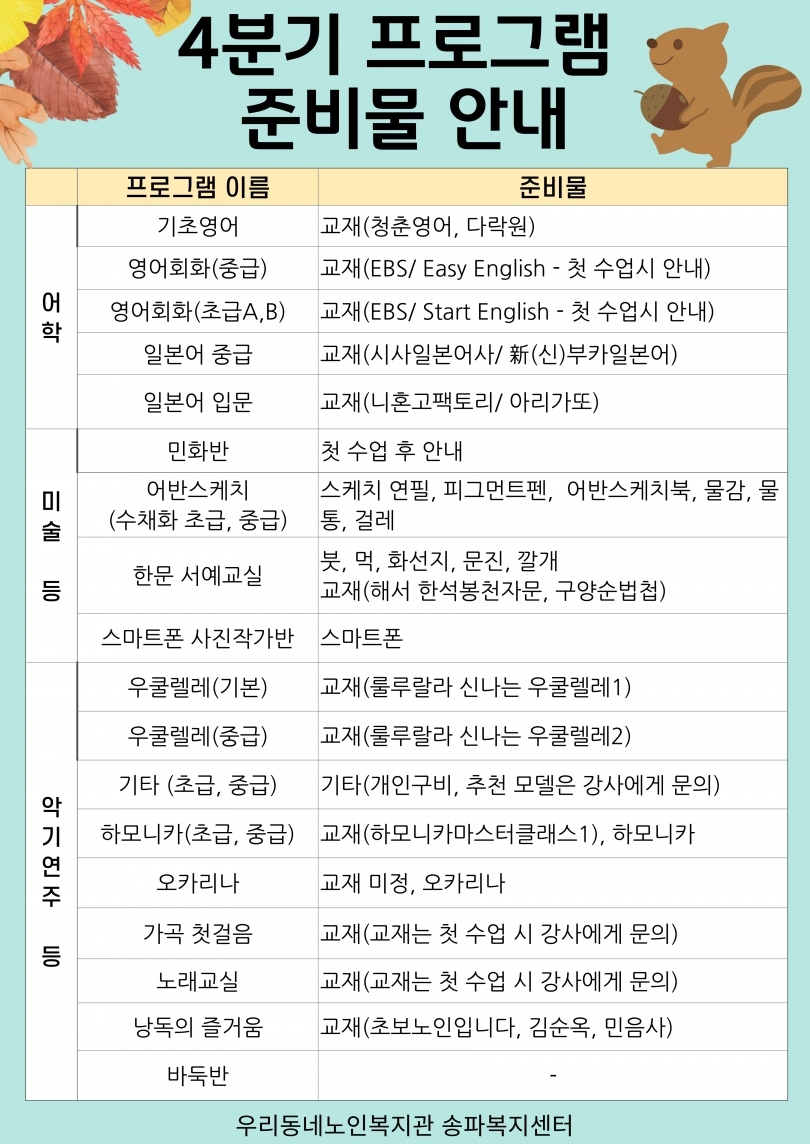 추석연휴, 개천절로 인해 10월 4일부터 개강하는 4분기 프로그램 준비물 안내드립니다.