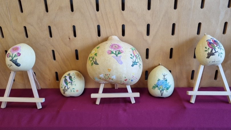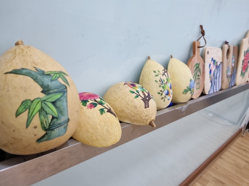 이런저런 방안을 모색하는 와중, 민화반 회원님이 “우리 집 옥상에서 직접 키운 박에 각자의 소망(건강, 행복, 장수 등)을 표현해보면 어떨까?”라고 제안해주셨어요. 소중히 키운 박에 각자의 소망을 담다니! 너무 좋은 아이디어죠? 우리는 제안을 덥썩 받아들였고, 박뿐만 아니라 나무판에도 추석 분위기를 담은 민화를 표현했습니다.