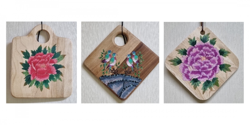 어느 회원님은 “집에서 그림 그리는 게 낙이야! 그리다 보니까 이렇게 많이 그려왔어~”라며 집에 있던 도마, 나무에도 그려주셨어요. 즐거운 마음으로 그린 작품들이 기관 곳곳에 걸려 명절 분위기가 조성되었습니다!