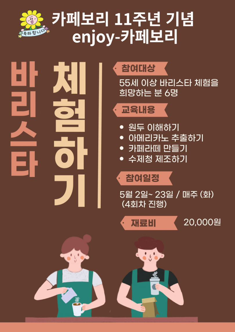 [프로그램 안내] 카페보리 11주년 기념 바리스타 체험 "ENJOY-카페보리" 안녕하세요 회원님! 카페보리가 2023년 5월 15일이 되면, 11주년이 됩니다. 누구나 한 번쯤 꿈꿨던 바리스타!! 그 꿈을 송파복지센터가 이뤄드립니다★ 수강료도 재료비 20,000원만 내면 끝! 원두에 대한 지식부터 에스프레소 추출, 마지막에는 내가 담은 수제청도 가져간다니 완전 이득이죠?! 희망하시는 분은 신청하세요! (마감되었습니다. 성원에 감사드립니다♥) 송파복지센터 이야기/교육문화 이야기 2023.05.16