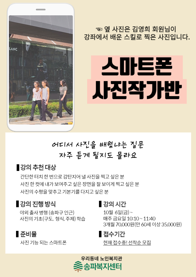 스마트폰 사진작가반 수강생 모집 항상 찍는 사진! 한번쯤 제대로 배워보고 싶진 않으셨나요?? 그렇다면 전문가가 알려주는 스마트폰 사진작가반에 오세요~ 송파복지센터 이야기/교육문화 이야기 2023.09.13
