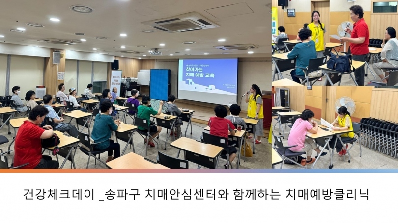 8.25 오전 9:30 송파복지센터 지하 강당에서 송파구 치매안심센터와 함께 하는 '치매 예방 클리닉'이 진행되었습니다. 치매가 왜 유발되는지 퀴즈를 통해 쉽게 알수있었고, 조기 치료와 생활 속 예방이 얼마나 중요한지 교육을 통해 알게되었습니다. 조기예방을 위해서 1년에 한번은 꼭 인지검사를 받아야 한다고 합니다. 아직 받지 못한 참여자분들도 이번기회에 1:1 인지선별 검사도 진행하였습니다. 치매예방교육과 함께 자신을 보듬어 주는 시간이 되었습니다. 우리 어르신들의 건강한 노후생활을 위하여 건강체크데이는 계속 이어집니다~~